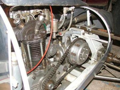 JAP 500cc 4B Speedway Engine producing 45 b.h.p. at 6,000 r.p.m. Total loss oil system by Pilgrim pump using seperate oil tank. B.T.H. magneto. Amal carburettor, gravity fed from 1 1/4 gallon tank mounted in streamlined head fairing. Transmission by chain to Burman four speed gearbox and muti-plate clutch then by chain to the centre of the rear axle and through universal joint half shafts to rear wheels.