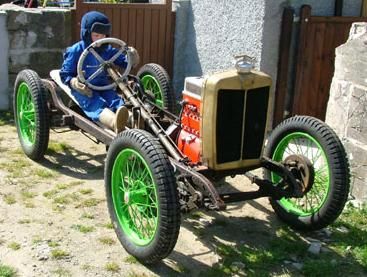 The 1931 MG M type in kit form but a bit futher on, it was a warm sunny day but I told you need to wear the right hat and gloves in a racing car! The Vintage sports car club VSCC can be found at www.vscc.co.uk . Lower down the page there is a picture of the engine in the workshop, as you can see it's a small workshop and it was kind of loud when the engine was running on the bench.