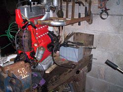 This is the M types engine sat on the bench at home, as you can see this was just after a test run asthe battery cables are held on with mole grips. The engine has had the original damaged crank shaft replaced with a counter balanced one and the cam shaft has been uprated to C type spec, so the engine should rev quite well.